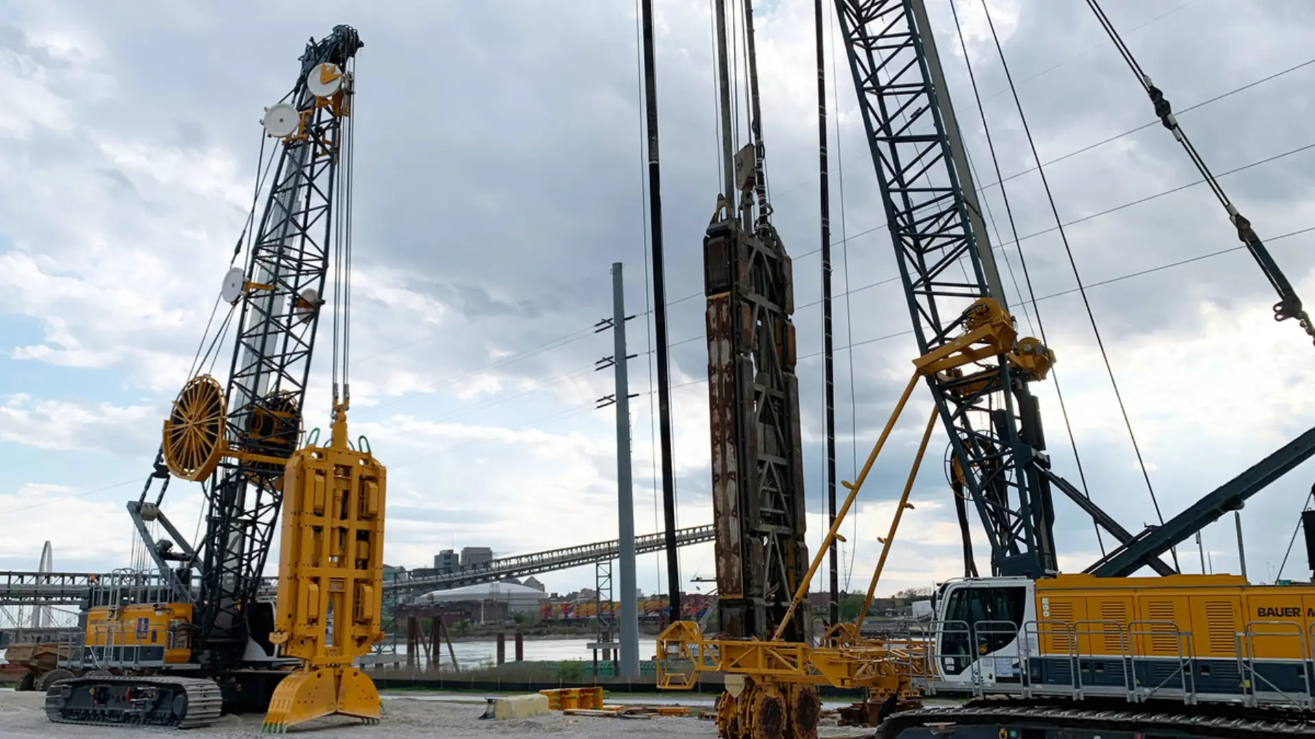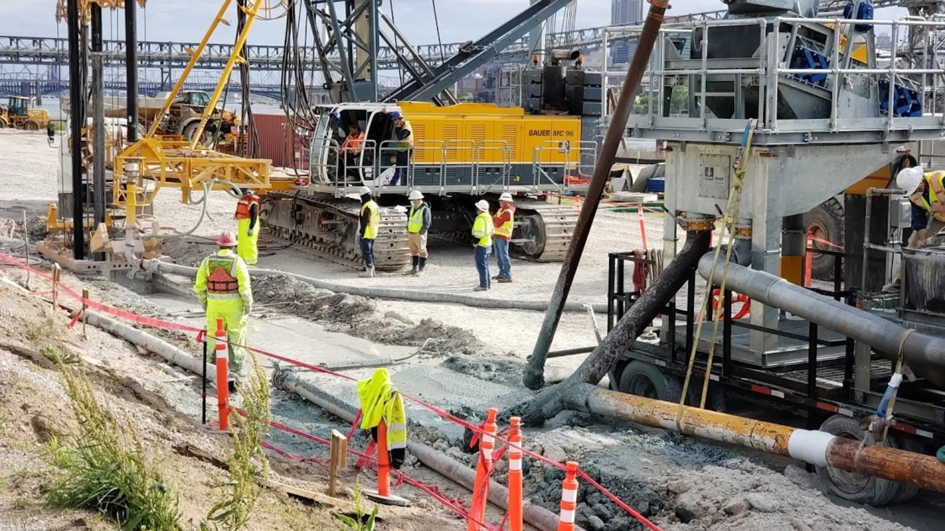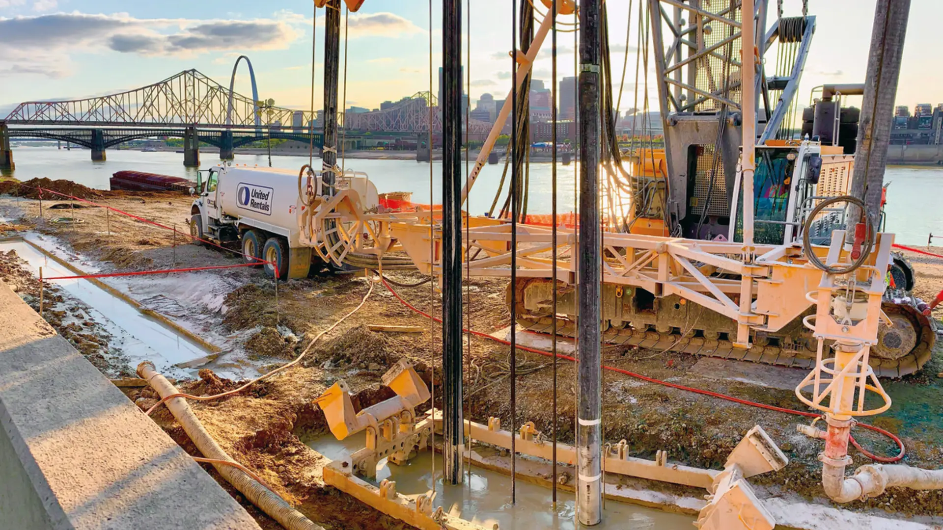 Im US-Bundesstaat Illinois wurde in East St. Louis am östlichen Ufer des Mississippi eine bestehende Deichstruktur ausgebaut. Aufgrund des sandigen Untergrunds, der das Einsickern von Wasser und damit verbundene Erosion ermöglichte, wurde eine umfangreiche Instandsetzung und Wiederherstellung des vorhandenen Deichs notwendig. Mithilfe einer Kombination aus Greif- und Frästechnik und unter Zugabe einer selbsthärtenden Suspension stellte unser Team auf einer Länge von 1,4 km rund 53.000 m² einphasige Dichtwand her. Das Besondere dabei: die Dichtwandelemente wurden bis in eine maximale Tiefe von 43,5 m hergestellt. Eine herausragende Leistung am Ufer des Mississippi.